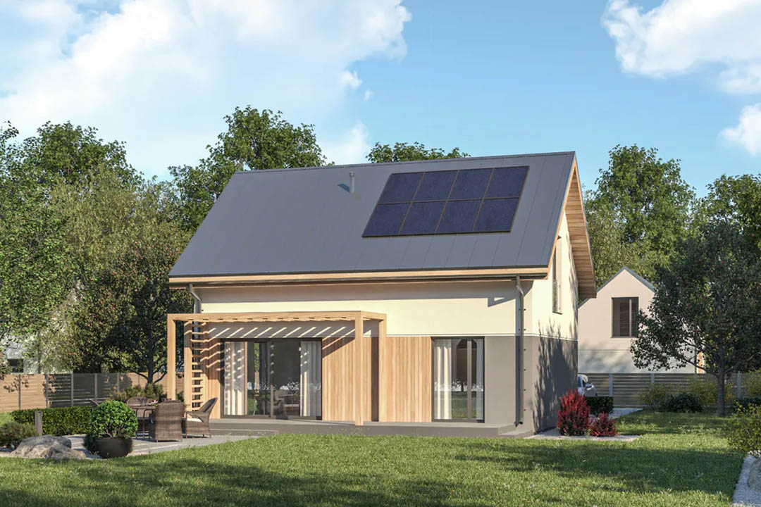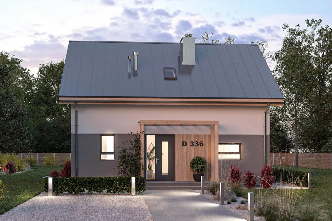 Model domu modułowego 95+ to wyjątkowa propozycja, która łączy w sobie atrakcyjny wygląd, przytulność oraz wysoką funkcjonalność. Projekt został stworzony z myślą o rodzinach liczących trzech lub czterech osób, zapewniając im wygodę na co dzień. Zwarta, prostokątna bryła budynku przykryta jest prostym, dwuspadowym dachem wykonanym z drewna. W bryłę domu wkomponowano przestronny garaż jednostanowiskowy, co podnosi komfort użytkowania.